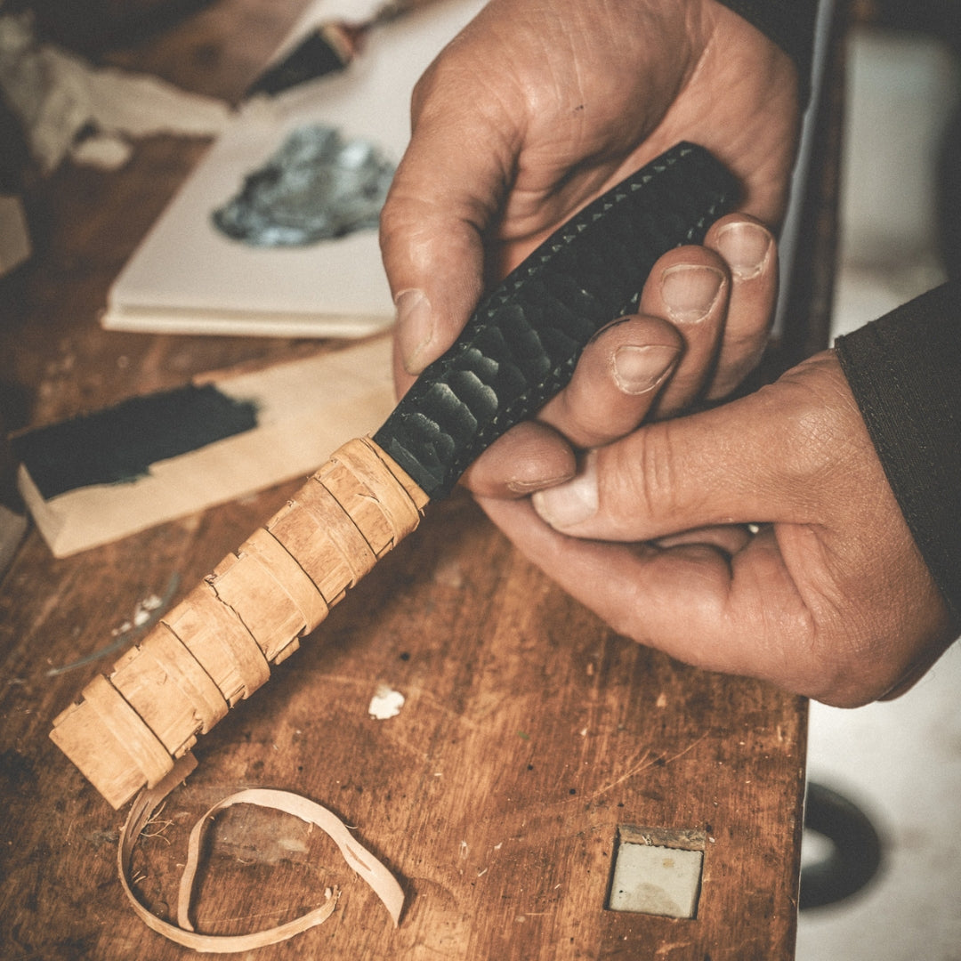 The knife is completed with a traditional hand-crafted sheath made from birch bark. This durable and functional sheath not only protects the blade but also complements the knife’s artisanal character.