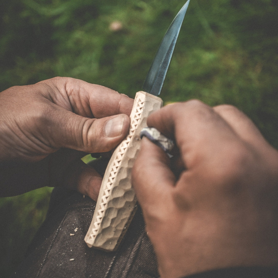 Bengt Waldemarson’s craftsmanship shines through in every detail of the knife’s handle. Made from birch, the handle is meticulously carved by hand, featuring a distinctive chip carving pattern.